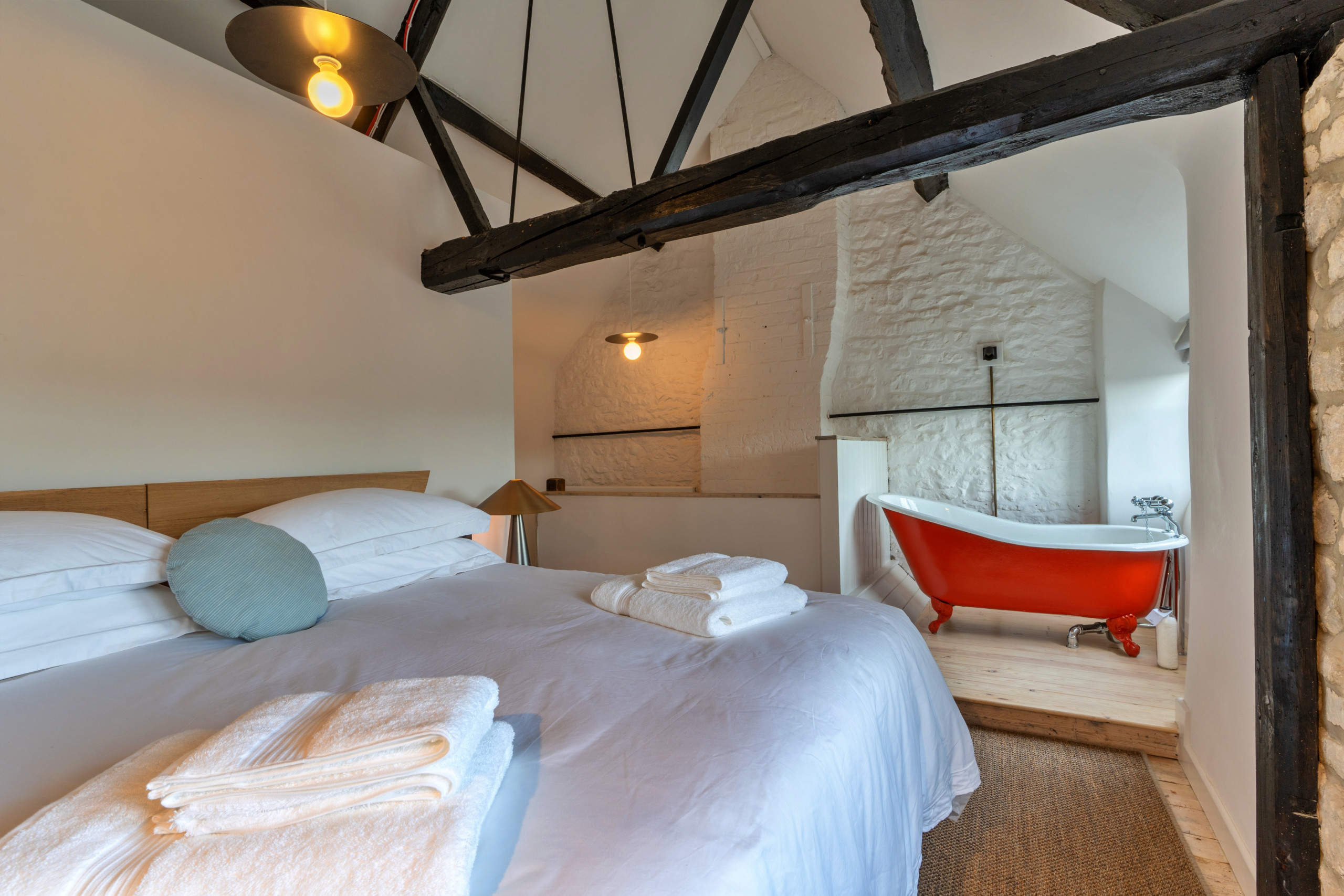 This time we climbed a period oak staircase that led to a more traditional room complete with ceiling beams, exposed stone walls, a hip bath in the corner of the bedroom, a separate ensuite shower room and three windows – one with a view into the courtyard below, another overlooking the meadows to the village beyond and the third peering over several Cotswold stone-tiled roofs and gables to the countryside and Painswick Hills.